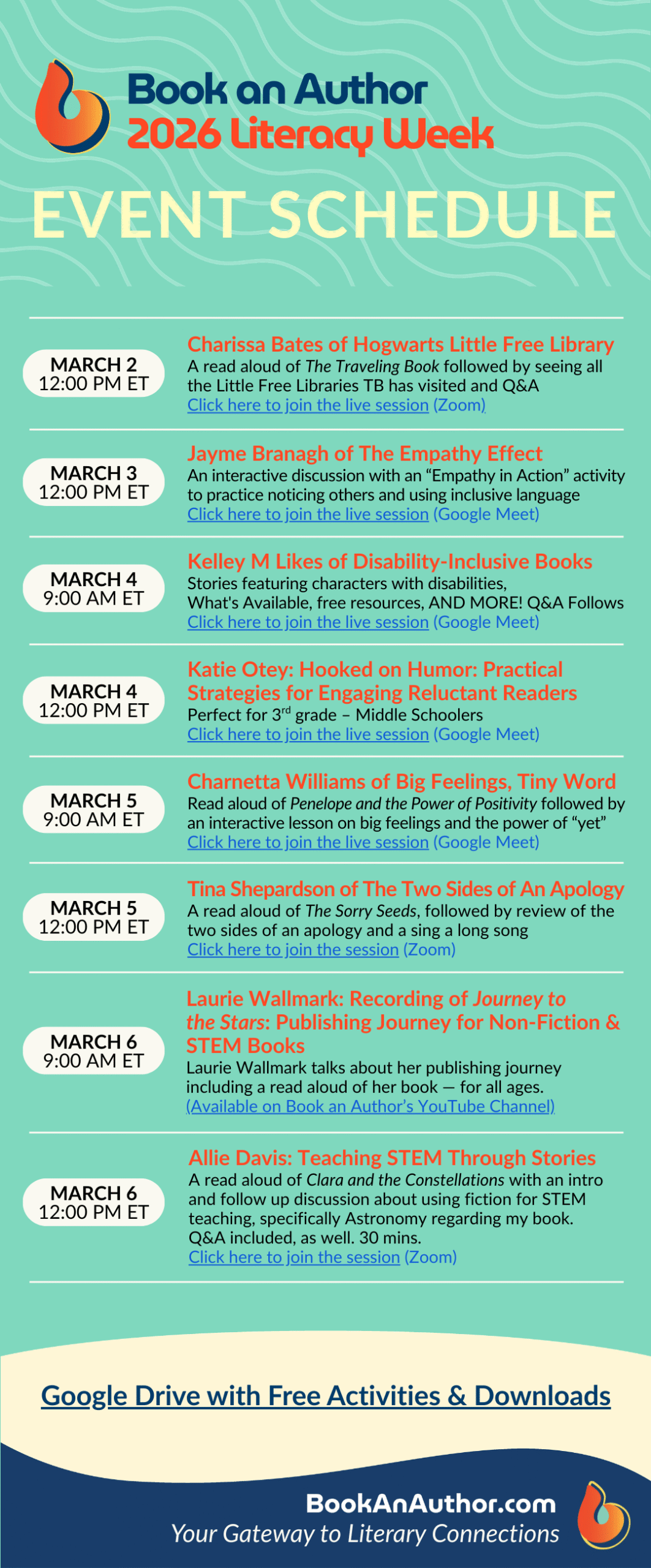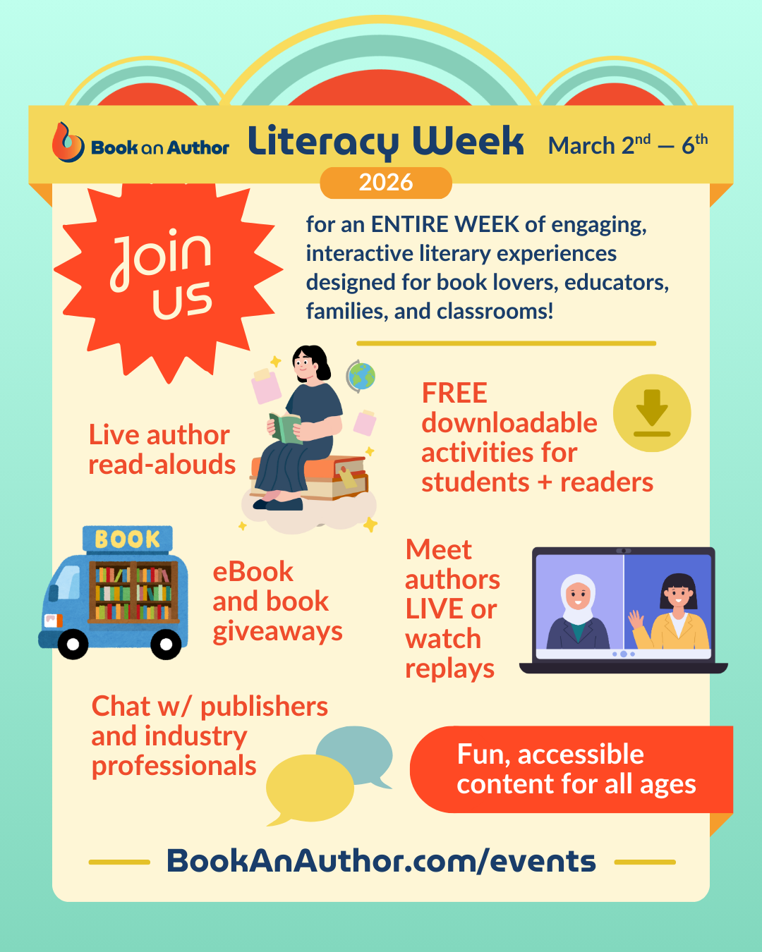 Book an Author is hosting a special week celebrating National Reading Month & Read Across America Week featuring incredible authors, publishers, librarians, editors, illustrators and MORE – and you’re invited! Join us for an entire week of engaging, interactive literary experiences designed for book lovers, educators, families, and classrooms.